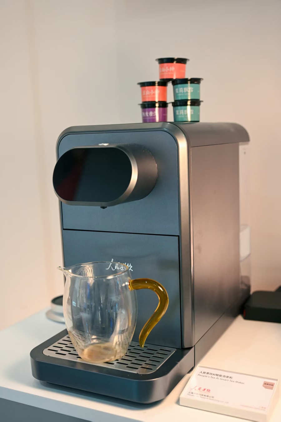 同样引人驻足的是人民茶饮AI智能泡茶机。它以“让中国茶简单好喝”为理念,搭载智能工夫茶冲泡系统。其内置的“识茶智慧眼睛”与MCU计算模块,可精准识别不同茶胶囊,实现“一碰即识、三秒出汤”的便捷体验。在保留传统茶韵的同时,机器还配备多媒体屏幕与语音控制系统,让饮茶更贴合当代人的生活习惯。