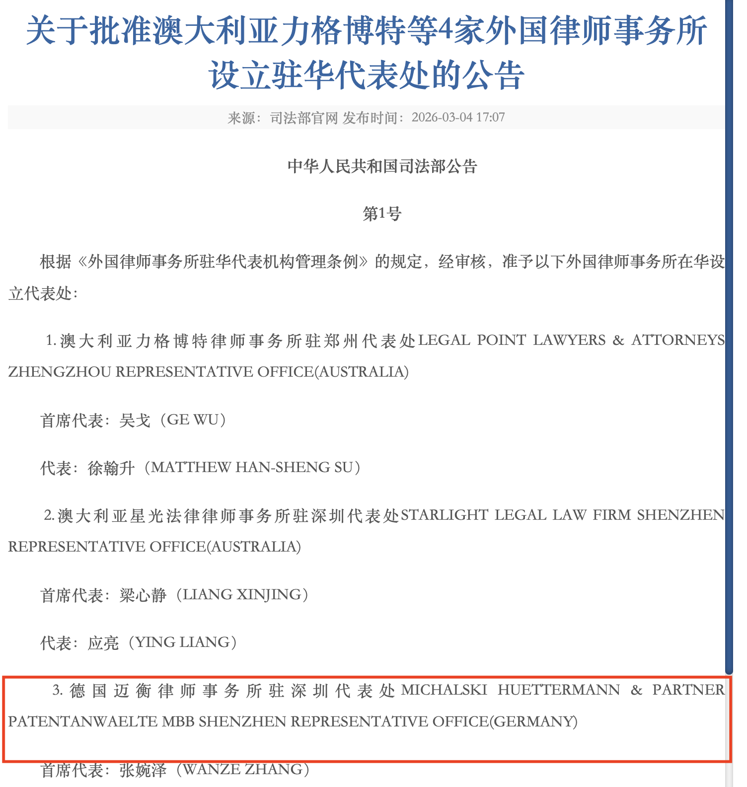 3月4日,司法部正式公告批准4家外国律师事务所驻华代表机构落户深圳。其中炒股配资资讯网,德国迈衡律师事务所驻深圳代表处将落户福田,标志着福田区涉外法律服务“朋友圈”又进一步扩大。